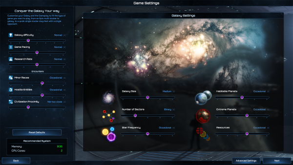 Note that increasing the overall size and amount of objects in play will increase the load on the computer’s Memory and CPU. For the best play experience, please ensure that the settings you choose fall within the Recommended System values at the bottom left of the screen. It is possible to play with values exceeding these, but the performance of the game could suffer, particularly in the late game when each Civilization is well developed and fielding a lot of fleets.